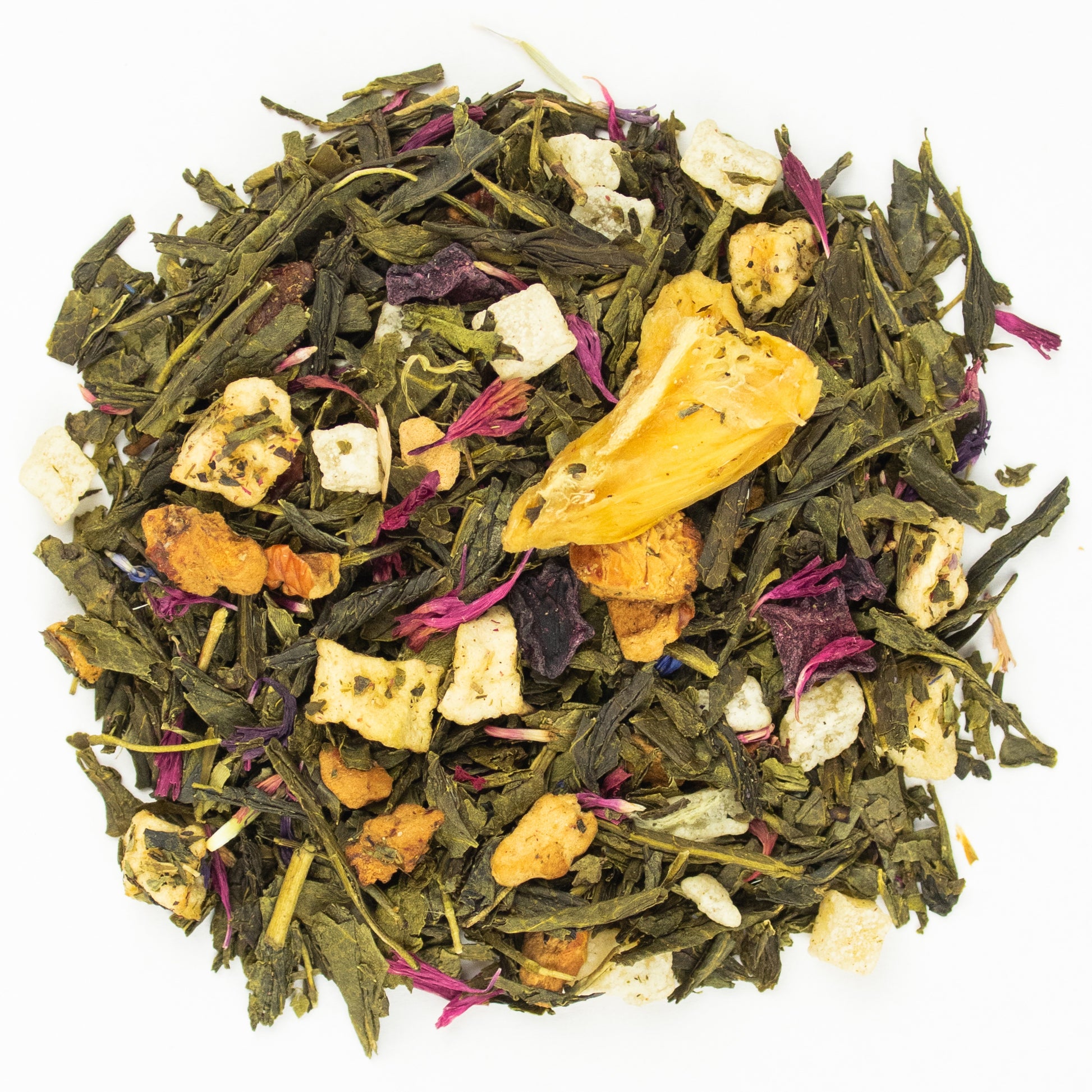 Zutaten: grüner Tee (52%), Mangowürfel (Mango, Zucker), Apfelstücke, gefr.-getr. Apfelstücke, gefr.-getr. Guavencrunchy (Guavenpüree, Apfelpüree, Apfelsaftkonzentrat), Mangoflocken, rote Beete, Kornblumenblüten.