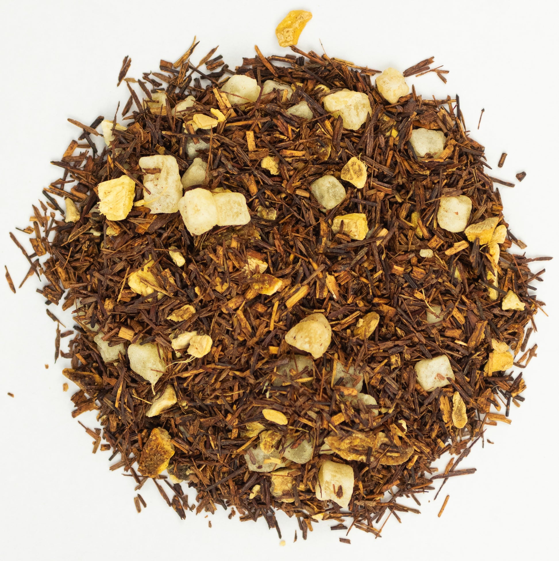 Zutaten: Rotbuschtee, Ingwerwürfel (Zucker, Ingwer), Ingwerstücke, Zitronenschalen, natürliches Zitronenaroma
