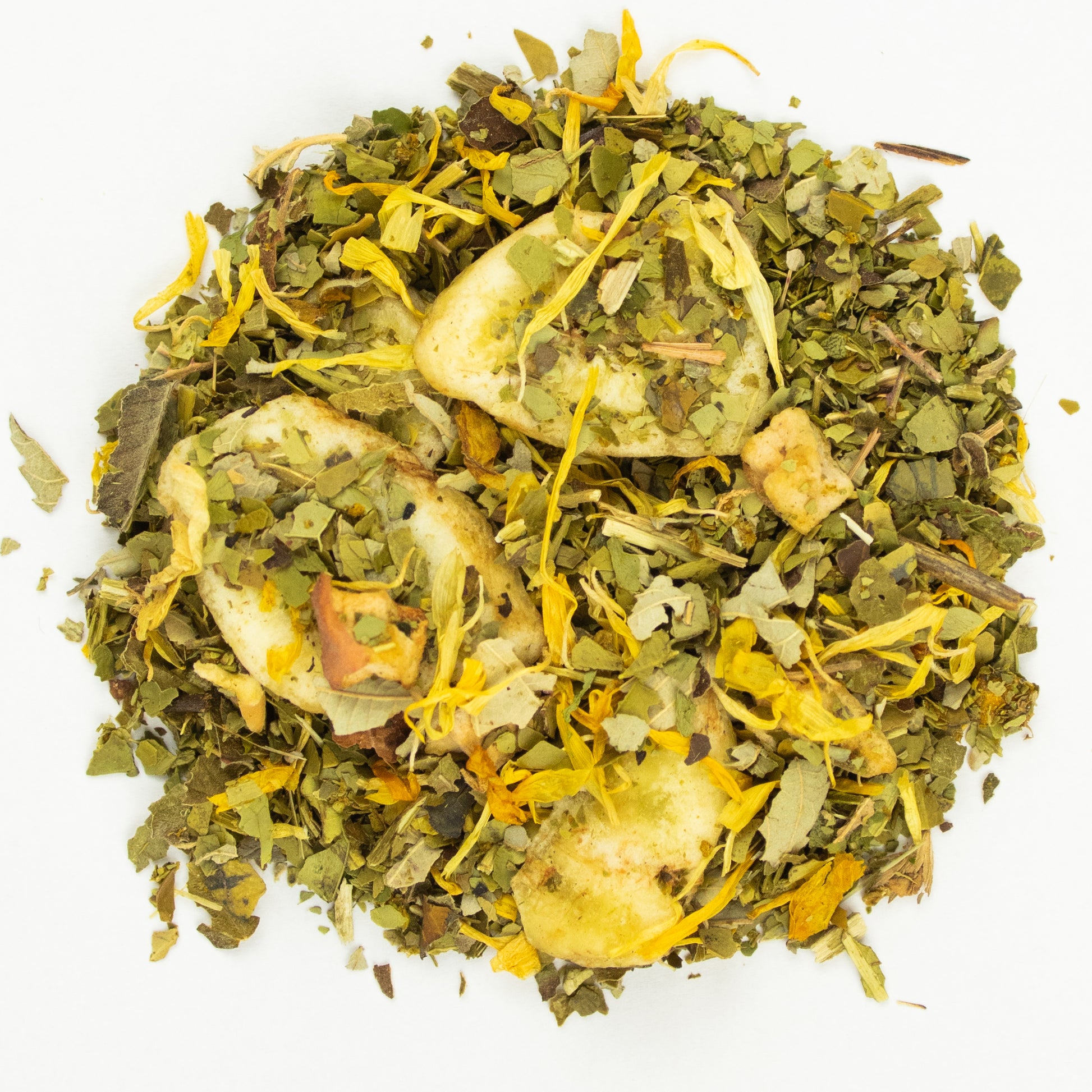 Zutaten: Brasilien Mate, Brombeerblätter, Apfelwürfel, Mangoflocken, Bananenchips (Banane, Kokosöl), gefr.-getr. Mandarinenorangenstücke, Ringelblumenblüten,