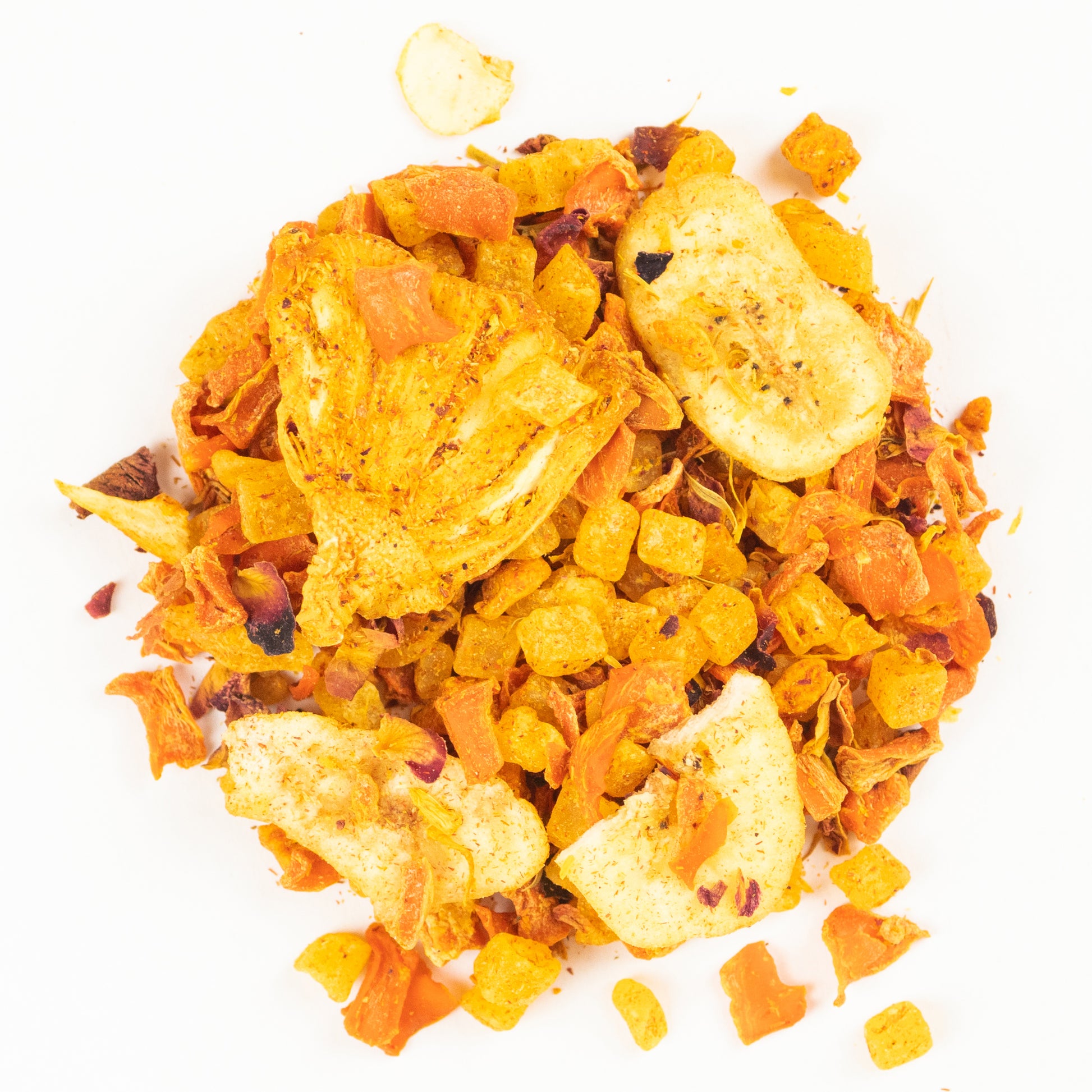 Zutaten: Ananaswürfel (Ananas, Zucker), Karottenflocken, Bananenchips (Banane, Kokosnussöl), Ananasflocken, gefr.-getr. Bananenstücke, Färberdistel, Ringelblumenblüten, dunkelrote Rosenblüten