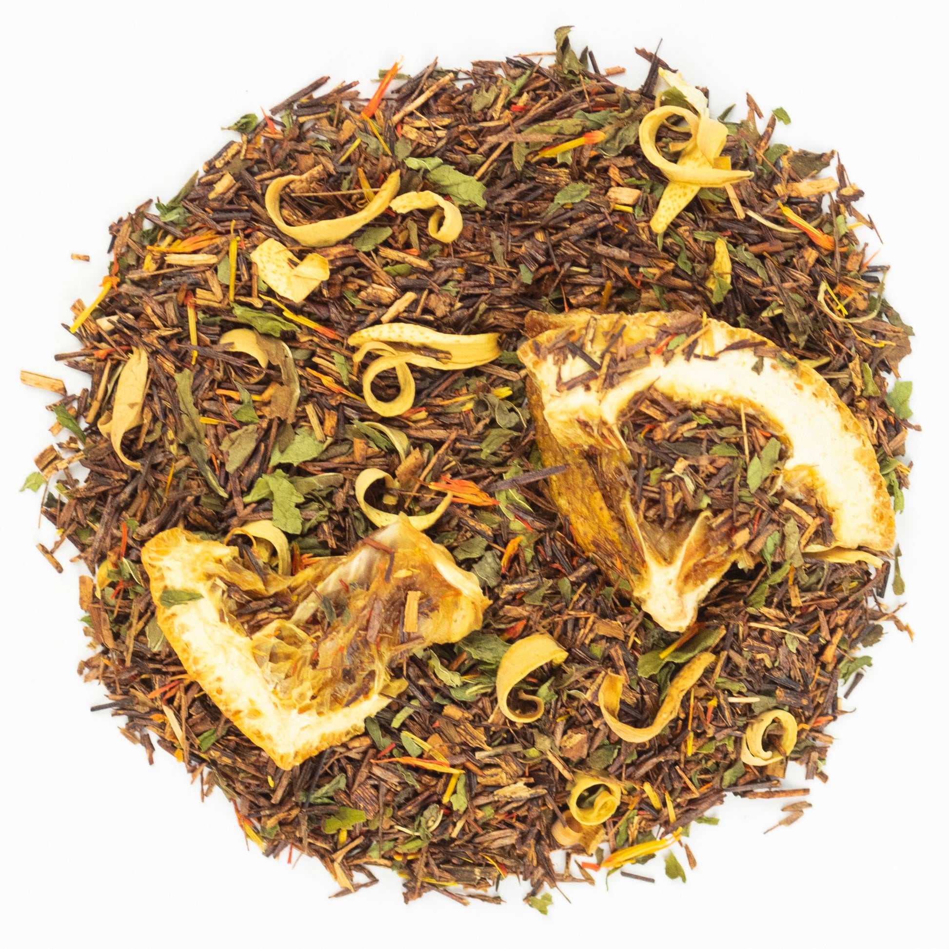 Zutaten: Rotbuschtee, Orangenspalten, Krauseminze (6%), Orangenblüten, Färberdisteln