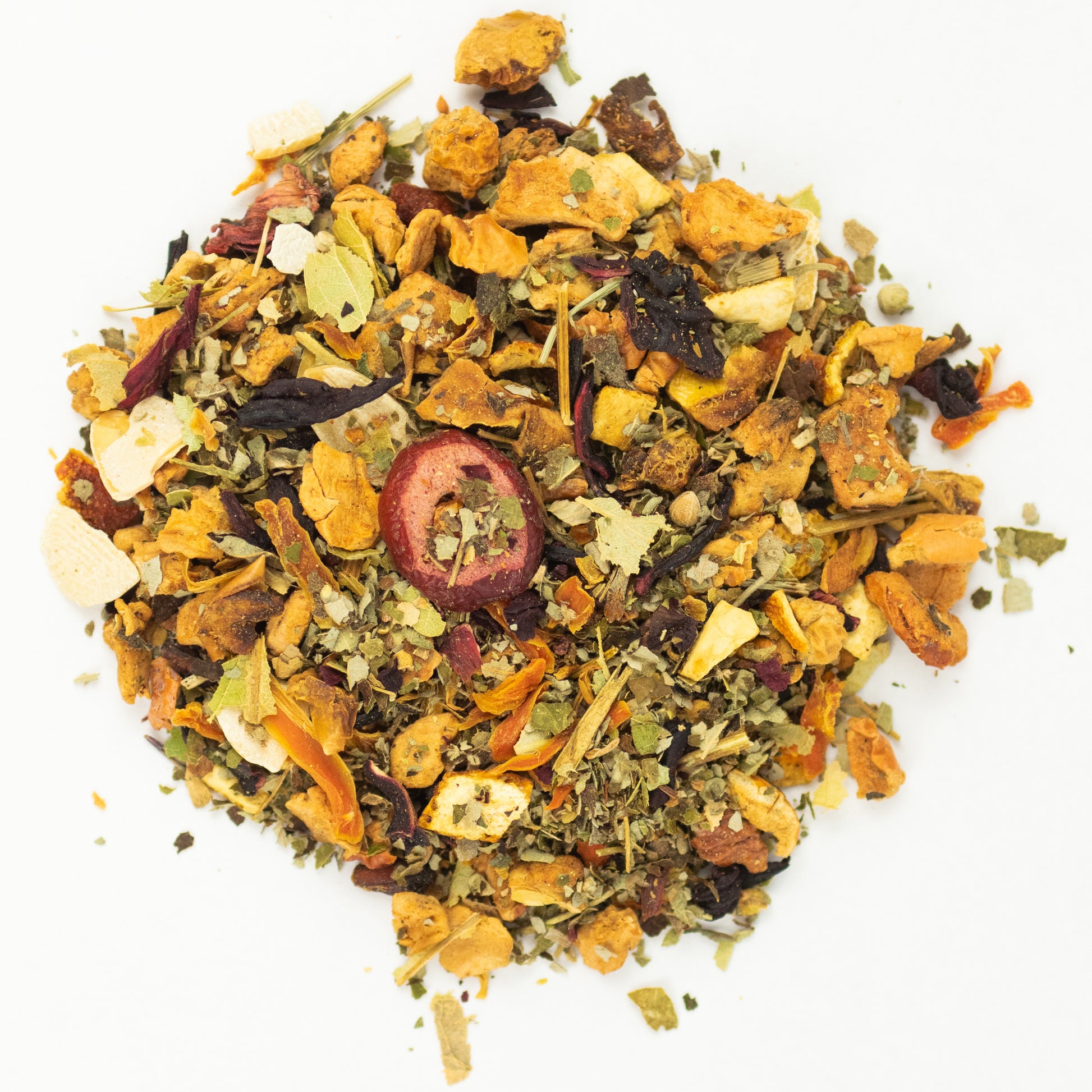 Zutaten: Apfelstücke, Orangenschalen, Hibiskusblüten, Brombeerblätter, gehobelte Mandeln, Karottenraspeln, Sternanis, Zimtstangen, Silberlindenblüten, gefr.-getr. Cranberryscheiben, Granatapelkerne, Bauernrosenblüten,