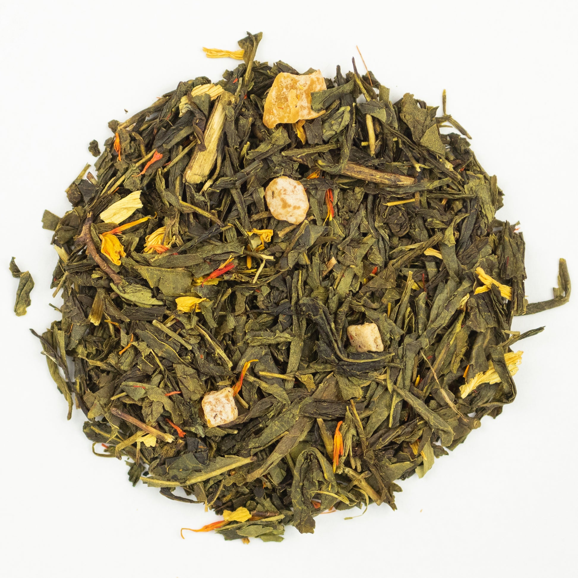 Zutaten: grüner Tee (83%), ananaswürfel (Ananas, Zucker), Mangowürfel (Mango, Zucker), Färberdisteln, Sonnenblumenblüten.
