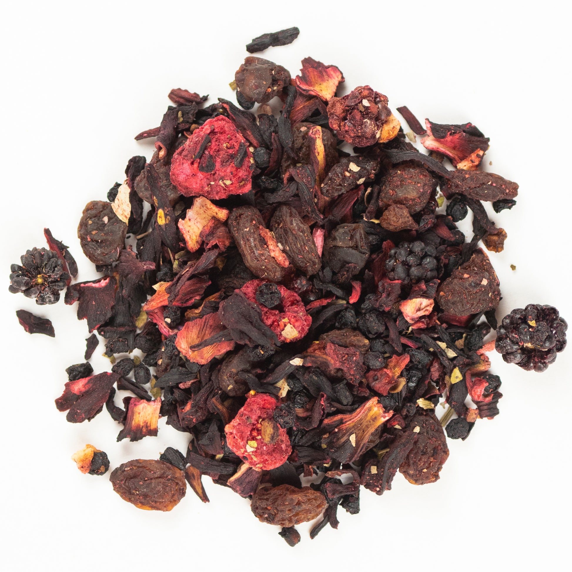 Zutaten: Sultaninen, Hibiskusblüten, Fliederbeeren, gefr.-getr. ganze Brombeeren, gefr.-getr. ganze Himbberen, gefr.-getr. Erdbeeren, Brombeerblätter, Heidelbeeren, schwarze Johannisbeeren