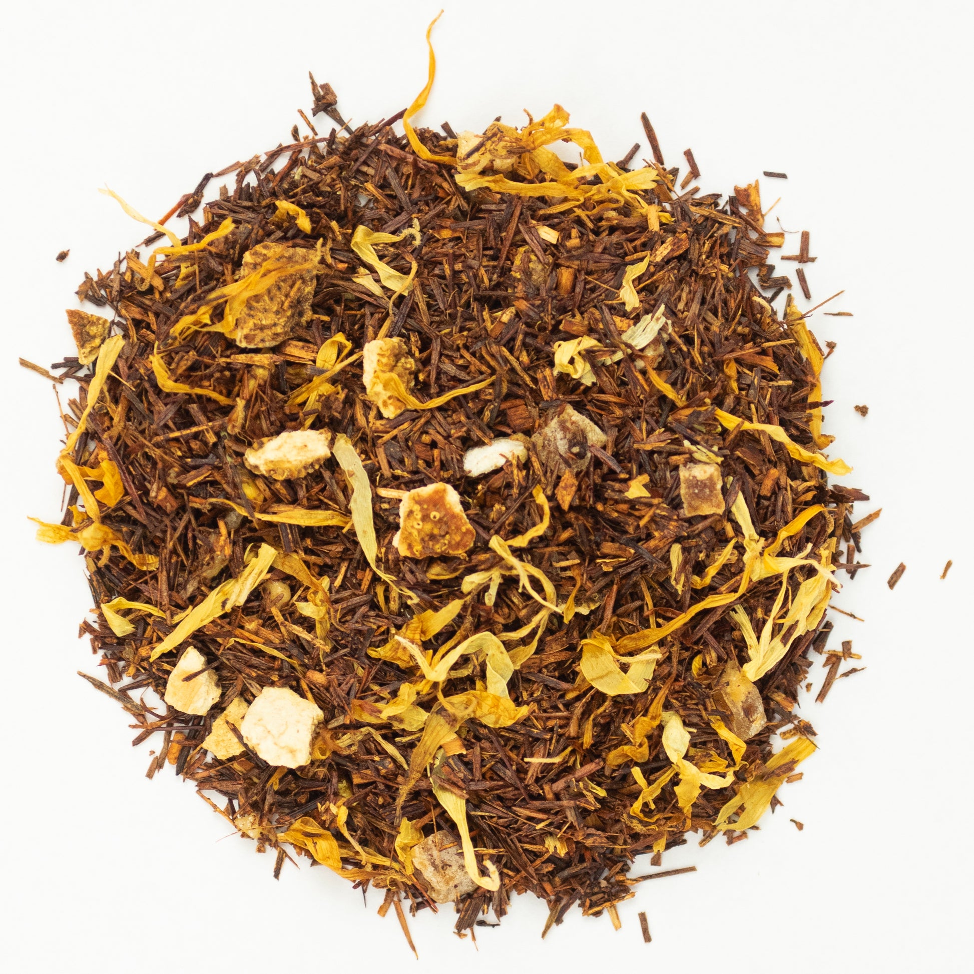 Zutaten: Rotbuschtee, Ananaswürfel (Ananas, Zucker), Zitronenschalen, gefr.-getr. Zitronengranulat (Maltodextrin, Frucht, natürliches Zitronenöl, Natrium-Alginat), gefr.-getr. Mandarinenorangenfruchtstücke, Ringelblumenblüten.