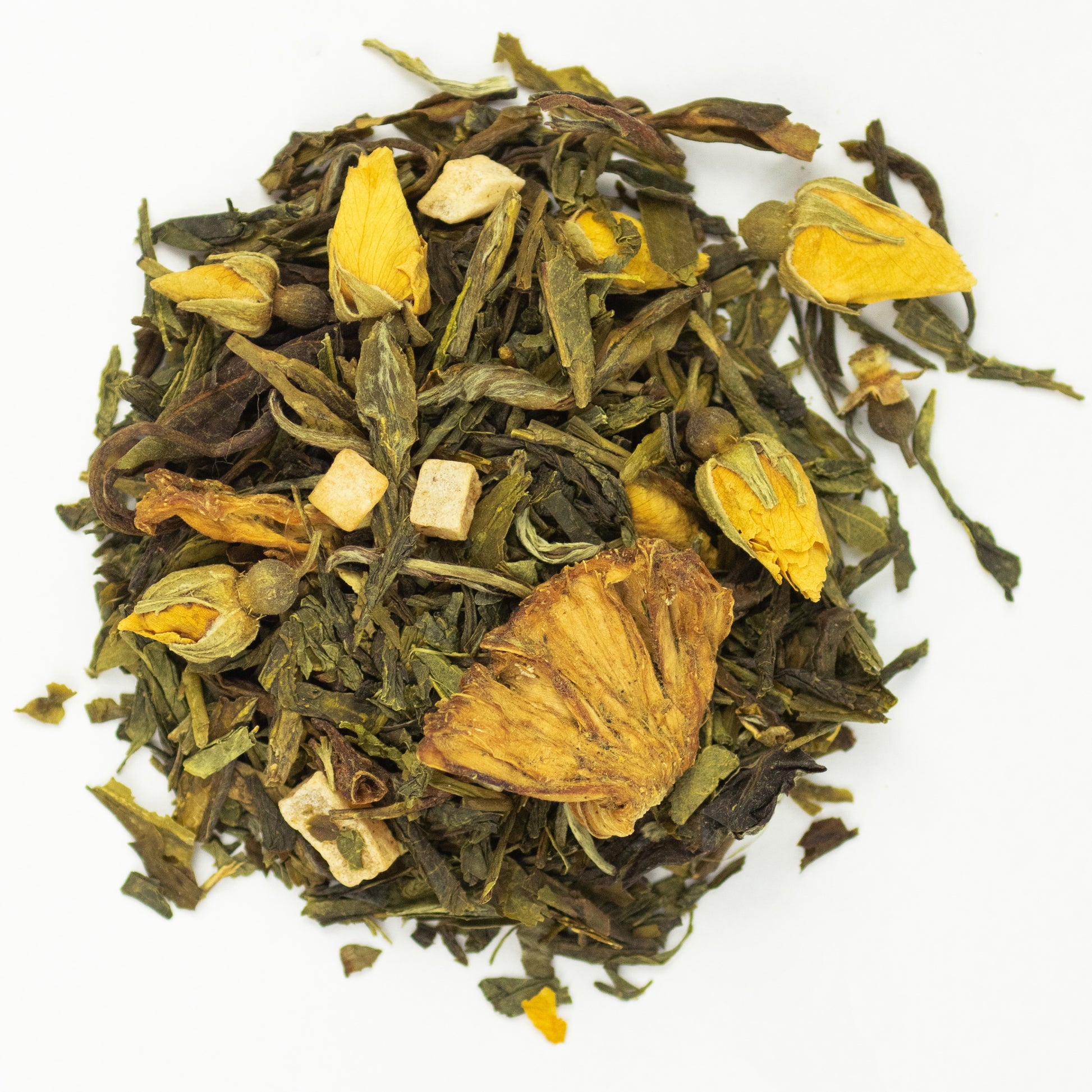 Zutaten: grüner Tee (81%), Sencha, Lung Ching, Yunnan, weißer Pai Mu Tan (8%), natürliches Aroma, Mangowürfel (Mango, Zucker), Ananasflocken, gelbe Rospenknospen