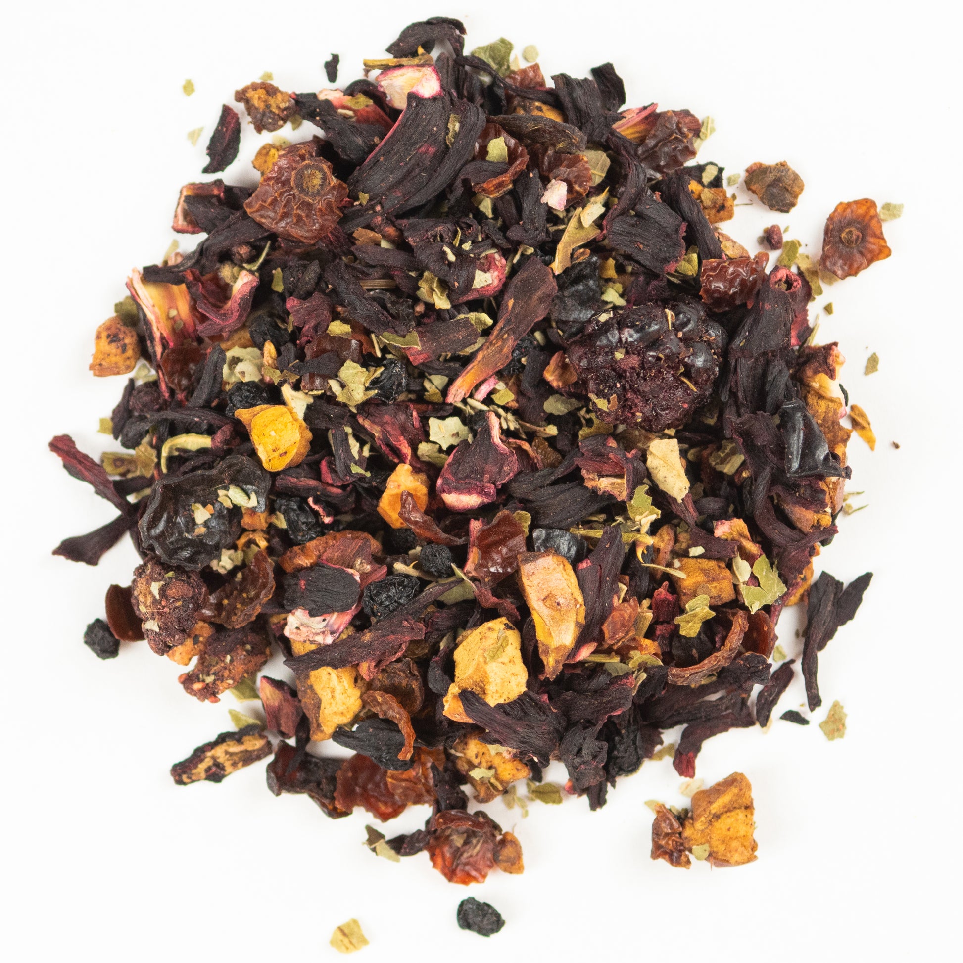 Zutaten: Hibiskusblüten, Hagebuttenschalen, Apfelstücke, Fliederbeeren, Brombeeren, gefr.-getr. ganze Brombeeren, gefr.-getr. Erdbeerstücke, gefr.-getr. Himbeerstücke