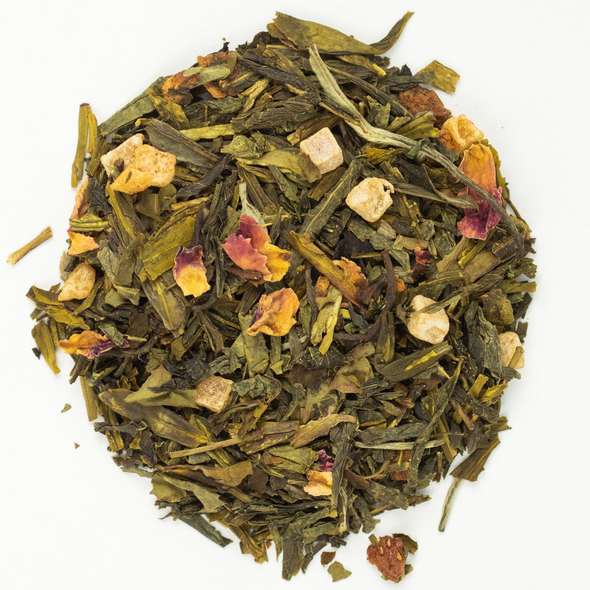 Zutaten: grüner Tee (56%), Lung Ching (20%), weißer Tee (10%), Pai Mu Tan, Papayawürfel (Papaya, Zucker), Ananaswürfel (Ananas, zucker), Rosenblüten, gefr.-getr. Erdbeerstücke.
