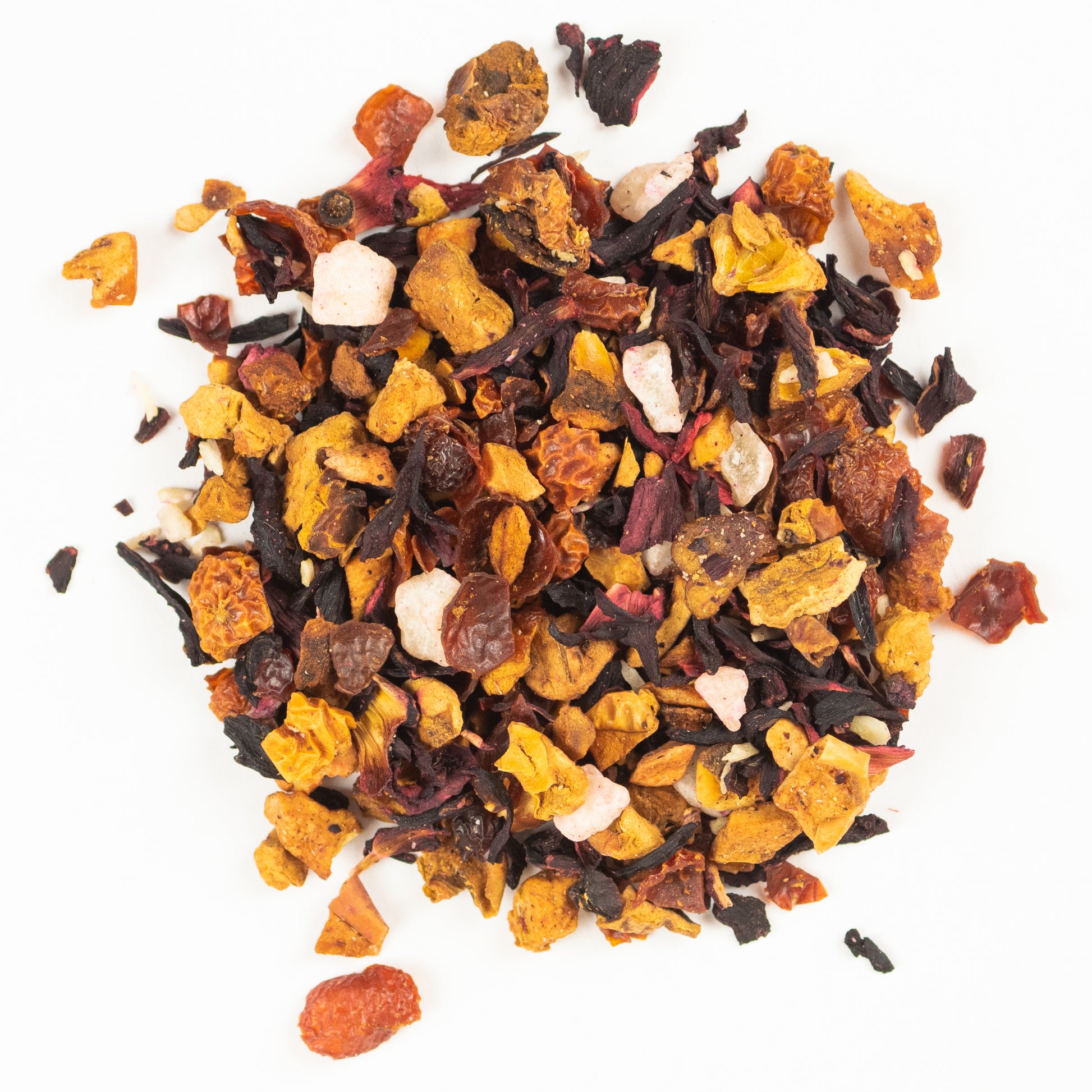 Zutaten: Apfelstücke, Hibiskusblüten, Hagebuttenschalen, Ananaswürfel (ananas, Zucker), Kokosraspeln