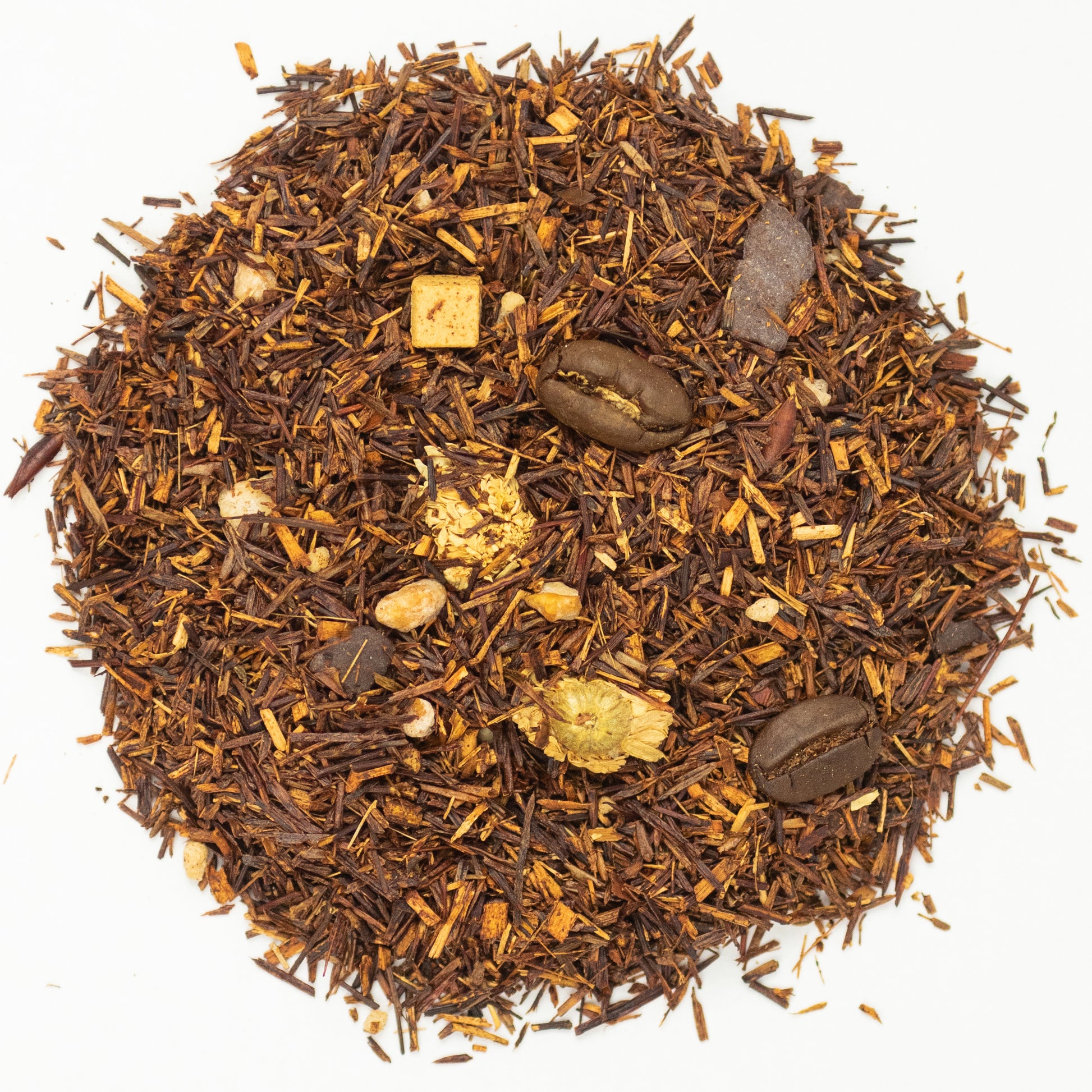 Zutaten: Rotbuschtee, Schokoladenplättchen(Zucker, kakaomasse, Kakaopulver, Soja-Lecithin), Krokantstücke (Zucker, Haselnusskerne, Invertzucker), Sahne-Karamellstücke (gezuckerte Kondensmagermilch, Zucker, Glukosesirup, Butterfett), gefr.-getr. Joghurtgranulat (Magermilchjoghurt, Zucker, Maltodextrin, modifizierte Stärke), geröstete Kaffeebohnen, römische Kamille