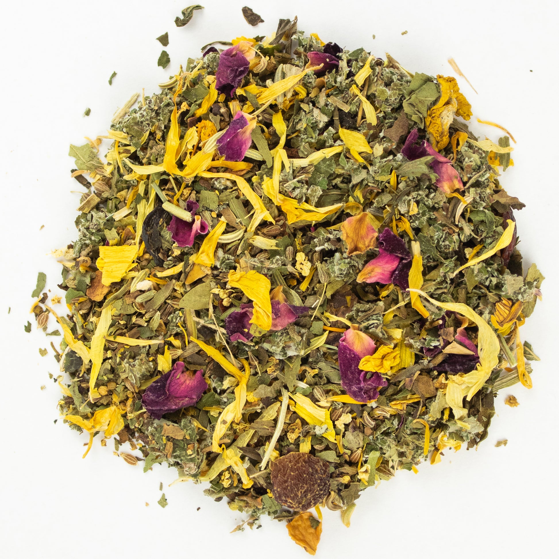 Zutaten: Himbeerblätter, Hagebuttenschalen, Anis, Apfelstücke, Fenchel, Brombeerblätter, Walderdbeerblätter, Pfefferminze, Ringelblumenblüten, Spitzwegerich, Holunderblüten, Mellisse, Sonnenblumenblüten, Pfingstrosenblüten, Wollblumenblüten,