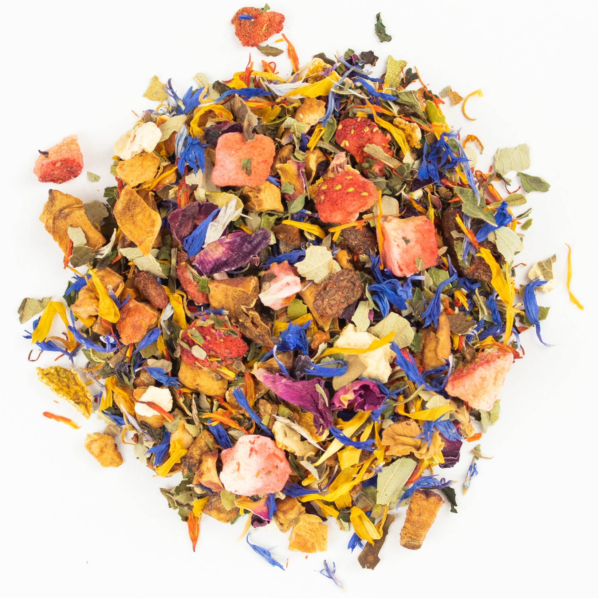 Zutaten: Apfelstücke, Brombeerblätter, Sultaninen, Orangenschalen, Färberdisteln, Pfefferminze, Lemon-.Myrtle, Zitronenschalen, Brennesselblätter, gefr.-getr. Erdbeerstücke, blaue Kornblumenblüten, Ringelblumenblüten, Rosenblüten,