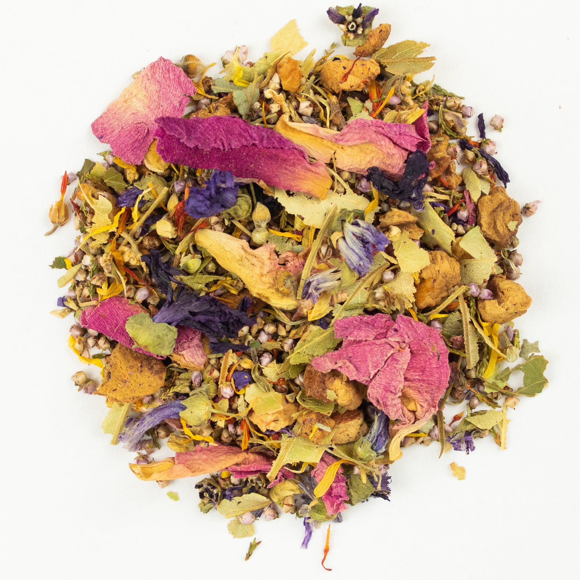 Zutaten: Apfelstücke, Heidekraut, Silberlindenblüten, Ringelblumenblüten, Malvenblüten, Färberdisteln, Bauernrosenblüten, natürliches Aroma