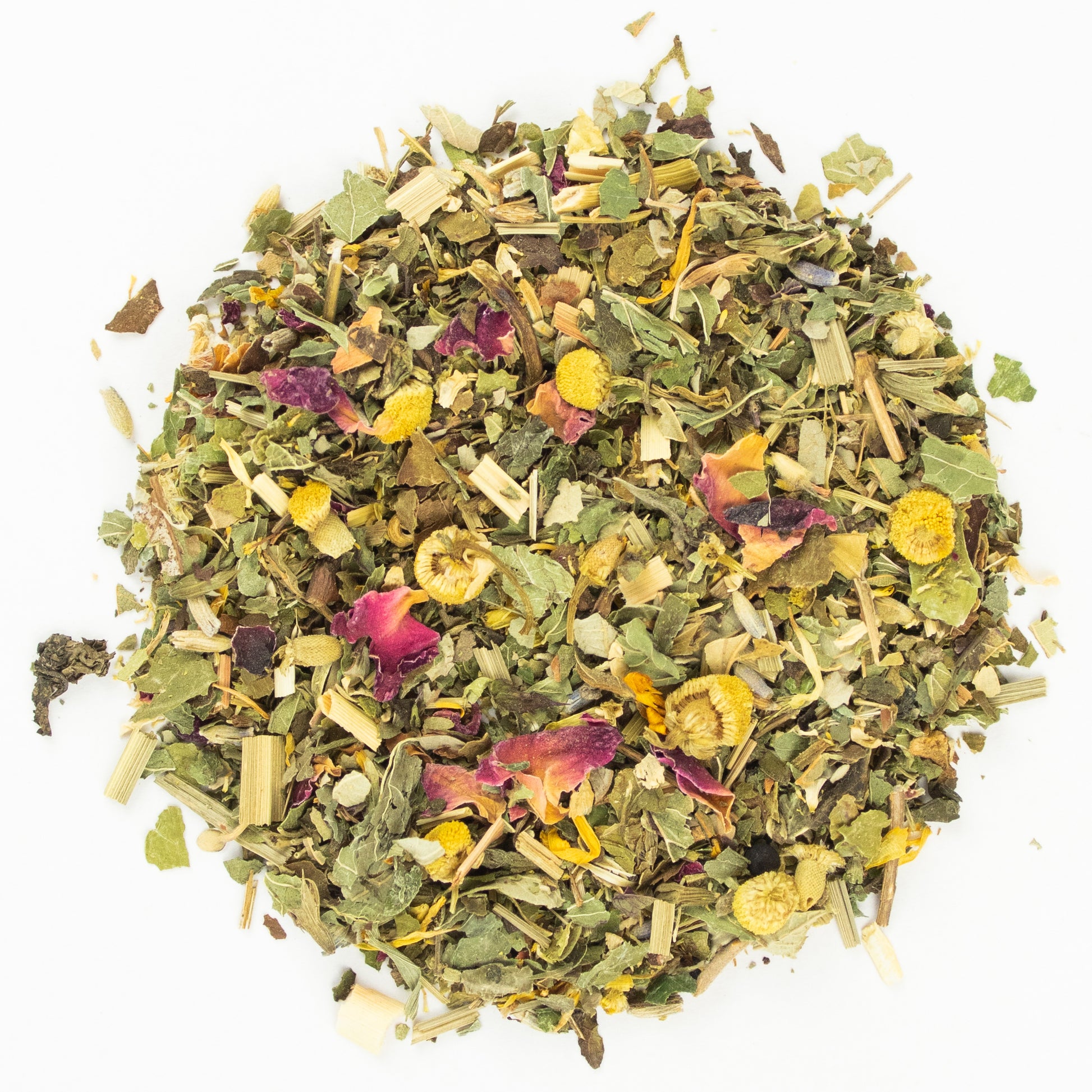 Zutaten: Brombeerblätter, Pfefferminze, Melissse, Kamille, Walderdbeerblätter, Zitronengras, Lavendelblüten, Rosenblüten, Ringelblumenblüten,
